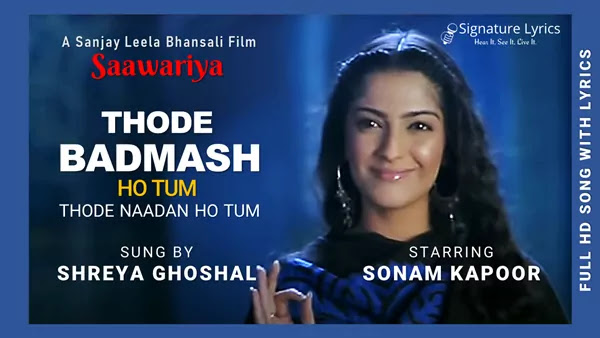 Thode Badmash Ho Tum Lyrics from Saawariya is a Soft Hindi Romantic Song sung by Shreya Ghoshal. Thode Badmash Ho Tum song lyrics are written by Nusrat Badr while the music is produced by Sanjay Leela Bhansali. In this post, you will find the lyrics and the music video of Thode Badmash Ho Tum Song starring Ranbir Kapoor & Sonam Kapoor.